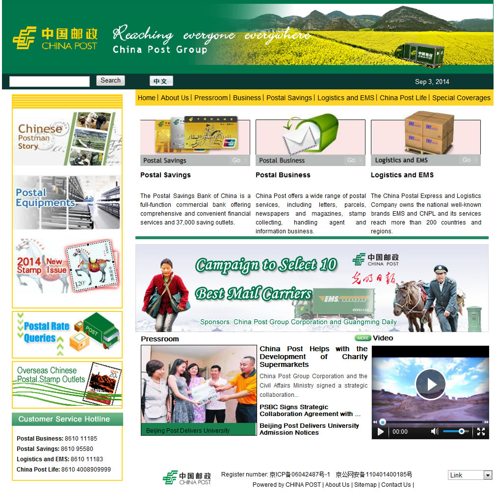 上線網(wǎng)站包括:“中國郵政官網(wǎng)”、“ChinaPost(中國郵政英文網(wǎng))”、“中國郵政視頻網(wǎng)”、“中國郵政總經(jīng)理信箱”、“中國郵政報(bào)記者之家”、“中國郵政人力資源網(wǎng)”、“中國郵政報(bào)”、“中國郵政集團(tuán)工會網(wǎng)”。