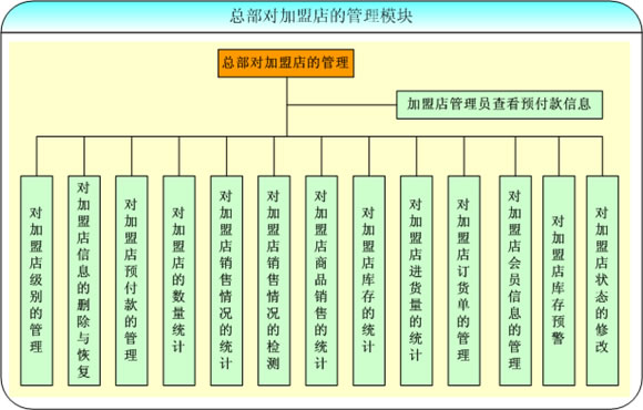 加盟店系統(tǒng)總部對(duì)加盟店管理模塊主要是用來實(shí)現(xiàn)總部對(duì)加盟店的級(jí)別、銷售情況、會(huì)員信息等相關(guān)的操作,可以分為總部管理加盟店的級(jí)別、總部對(duì)加盟店的信息刪除與恢復(fù)、總部對(duì)加盟店預(yù)付款的管理等部分,該模塊是加盟店管理系統(tǒng)中一個(gè)重要的組成部分。