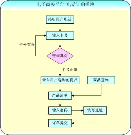 電子商務平臺-電話訂購模塊的功能與網上購物的功能有一定的差別,該功能目前只針對會員卡。顧客打進電話,呼叫坐席在我們的電話訂購功能里面輸入顧客的會員卡號、所購商品、郵寄地址。當訂單提交成功以后,系統(tǒng)數(shù)據(jù)庫中就會相應地扣除用戶所購商品的金額,當貨物送到以后,用戶需用會員卡在我們的手持終端刷卡,從卡中扣除相應的錢數(shù),此時,一次完整的電話訂購交易結束。