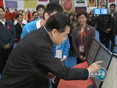 在咨詢熱線展位,胡錦濤俯身瀏覽“首都紅絲帶”網(wǎng)站內(nèi)容,向我公司工作人員詢問(wèn)網(wǎng)站建設(shè)情況。瀏覽過(guò)程中,胡錦濤鼓勵(lì)在場(chǎng)的本公司技術(shù)人員要建設(shè)好“首都紅絲帶”網(wǎng)站。他說(shuō),在互聯(lián)網(wǎng)迅速發(fā)展的今天,網(wǎng)絡(luò)為我們開(kāi)展防治艾滋病工作提供了一個(gè)新的有效手段。希望“首都紅絲帶”網(wǎng)站越辦越好,在防治艾滋病工作中發(fā)揮更大作用。