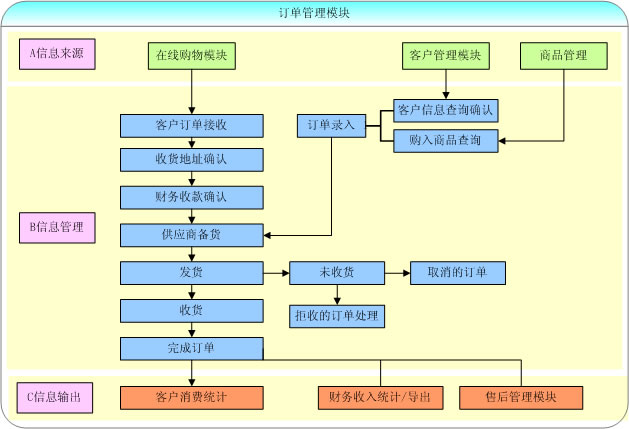 訂單管理模塊,從用戶購買商品下單到訂單的確認,收款確認,到供貨,到訂單的查詢,是客戶購買商品的訂單提交后的一系列管理工作流程.