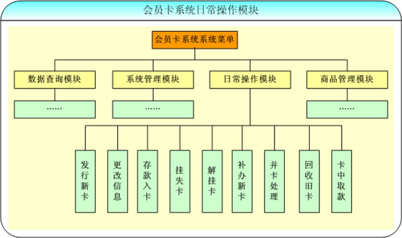 會(huì)員卡系統(tǒng)中的日常操作模塊主要完成針對(duì)卡的各種操作,分為發(fā)行新卡、更改信息、存款入卡、掛失卡、解掛卡等多個(gè)部分,是會(huì)員卡管理系統(tǒng)中一個(gè)重要的組成部分。