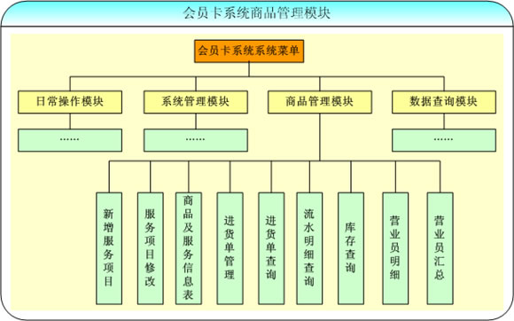 會(huì)員卡系統(tǒng)中的商品管理模塊主要是對系統(tǒng)中商品的各項(xiàng)操作,分為新增服務(wù)項(xiàng)目、服務(wù)項(xiàng)目修改、商品及服務(wù)信息表、進(jìn)貨單管理、進(jìn)貨單查詢等多個(gè)部分,是會(huì)員卡管理系統(tǒng)中一個(gè)重要的組成部分。